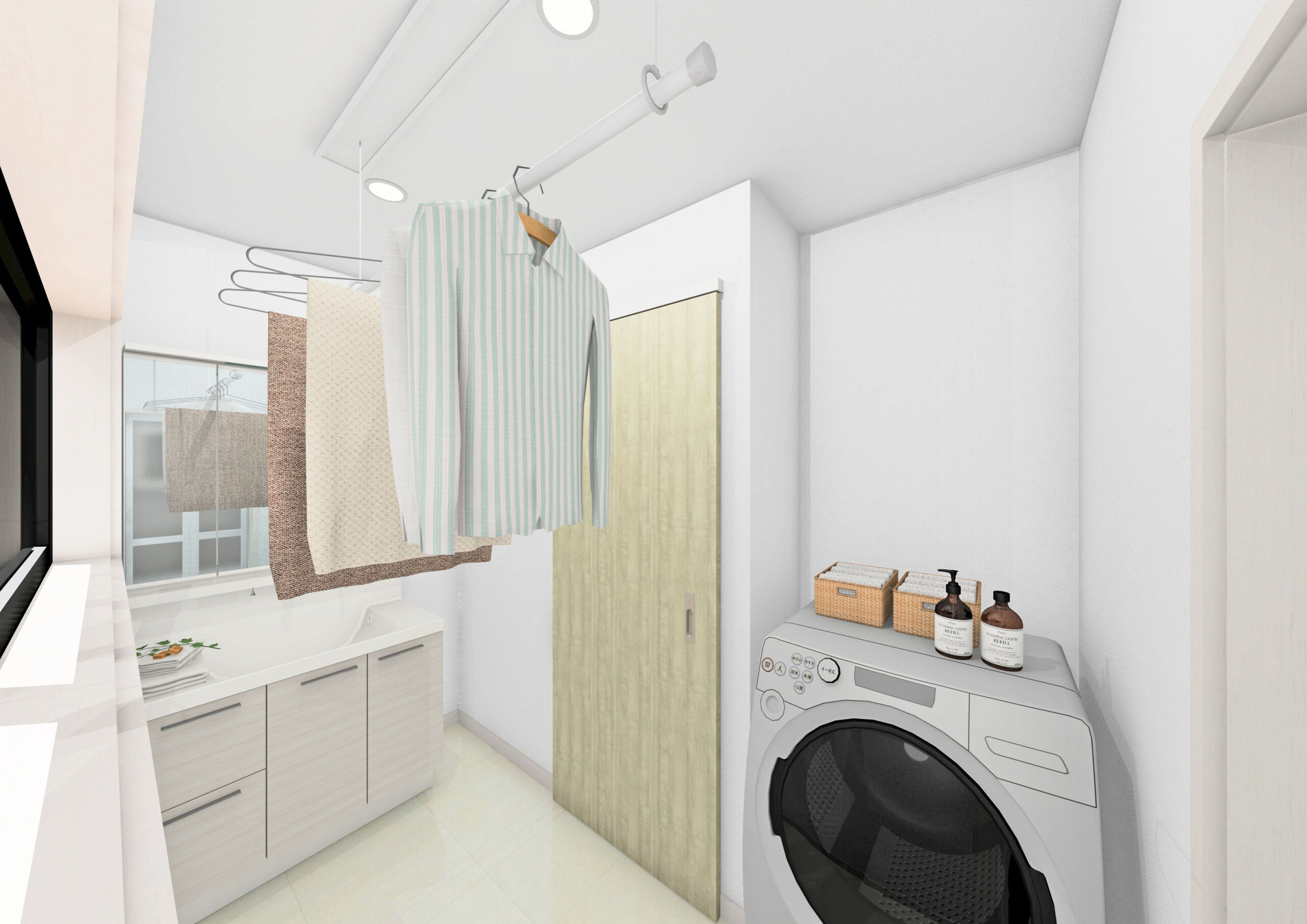 洗面脱衣室には昇降式の物干し金具を設置。