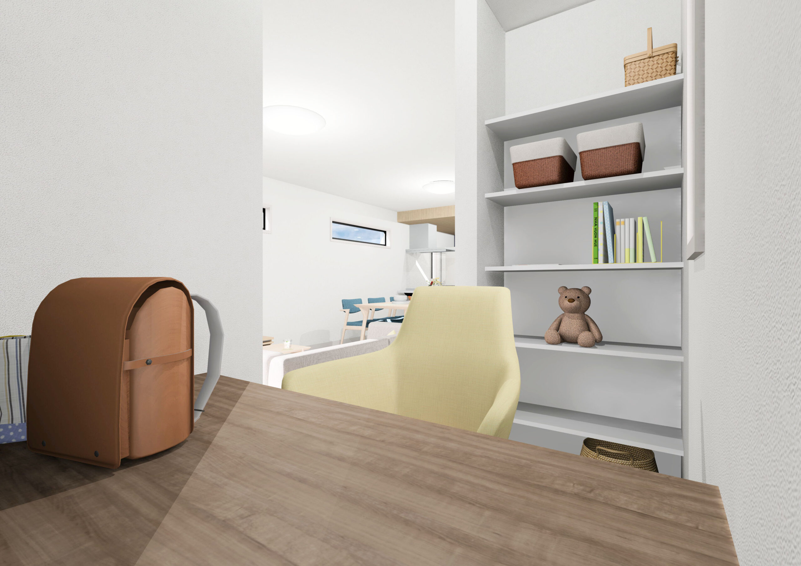 キッチン横には可動棚がついた物入を設置。ストック品の保管に便利