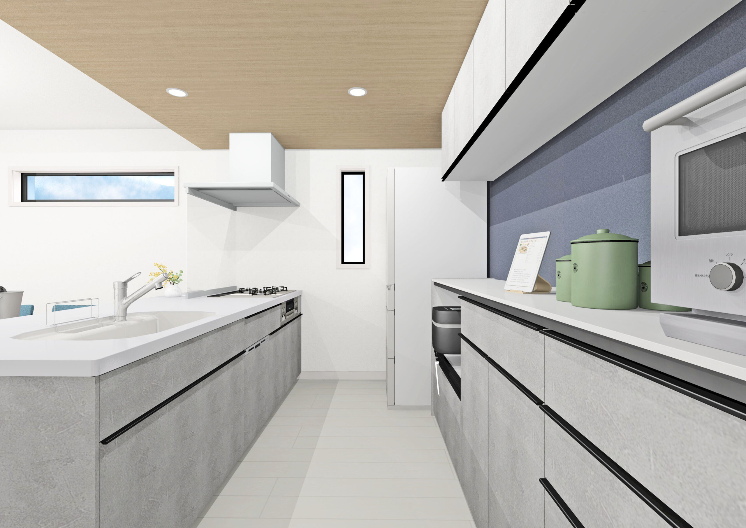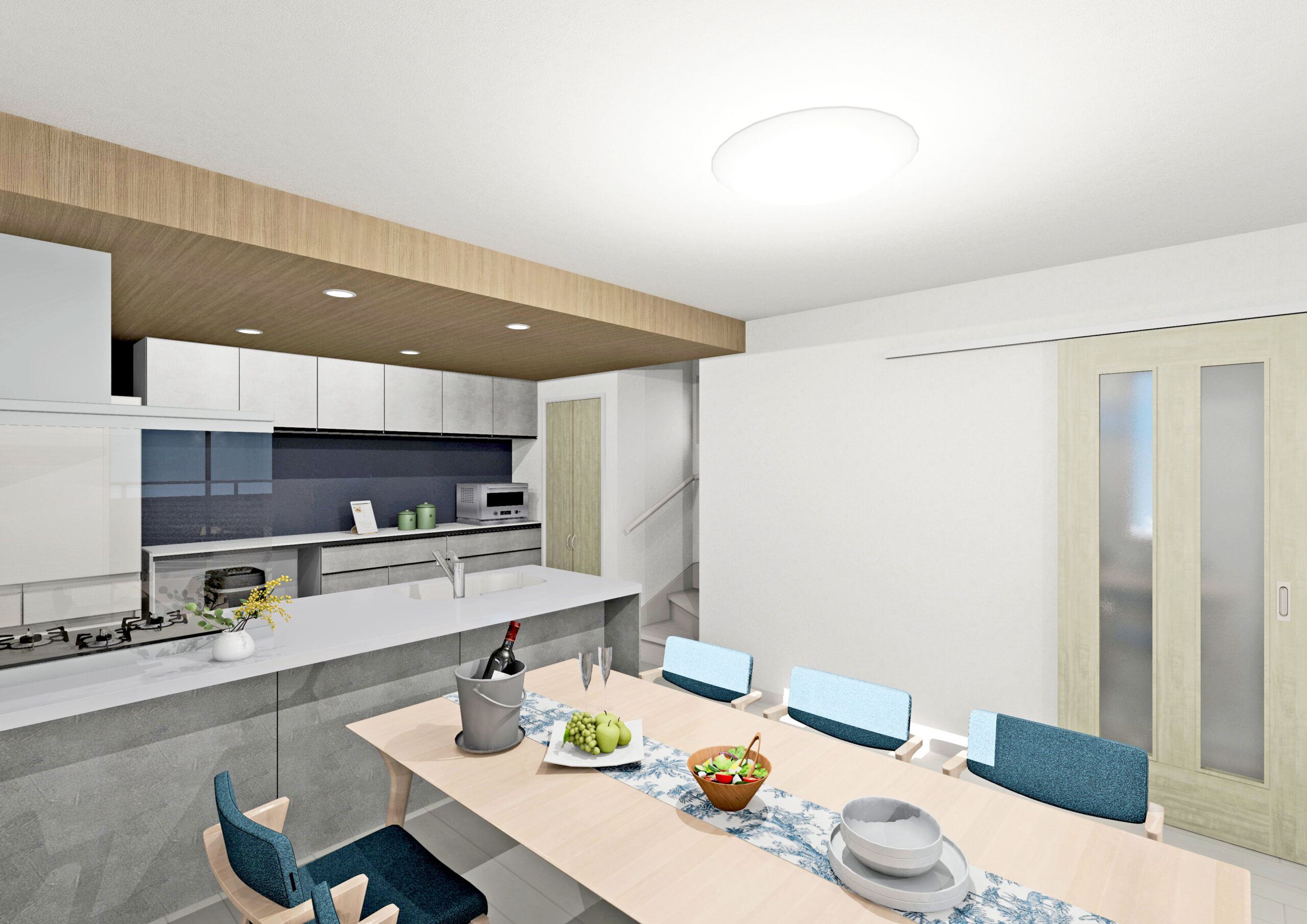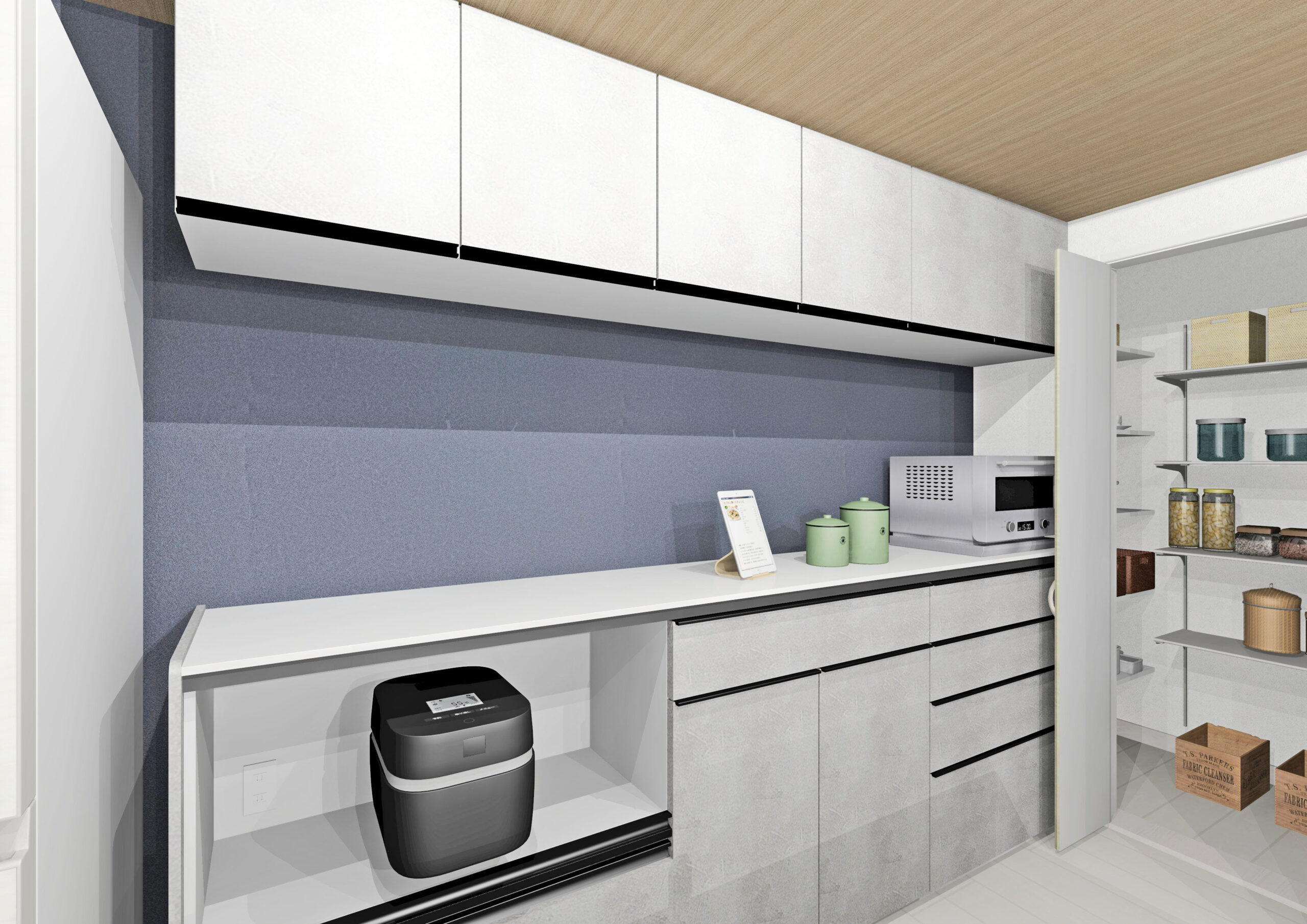 ペニンシュラキッチン(テーブルタイプ)にカップボードを標準装備し、機能性とデザイン性を両立