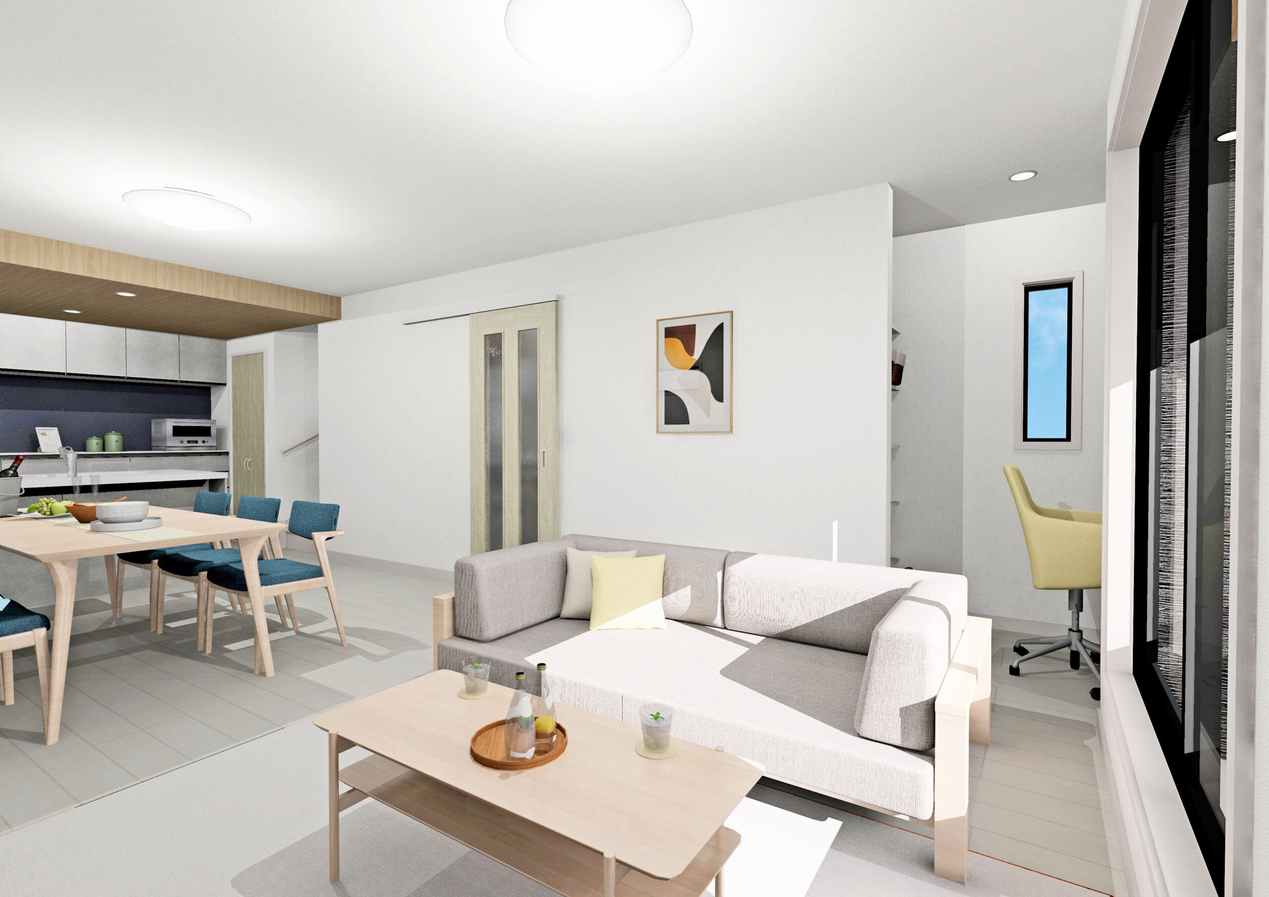 19.5帖の大空間LDKは、折下げ天井による奥行きと開放感が魅力。