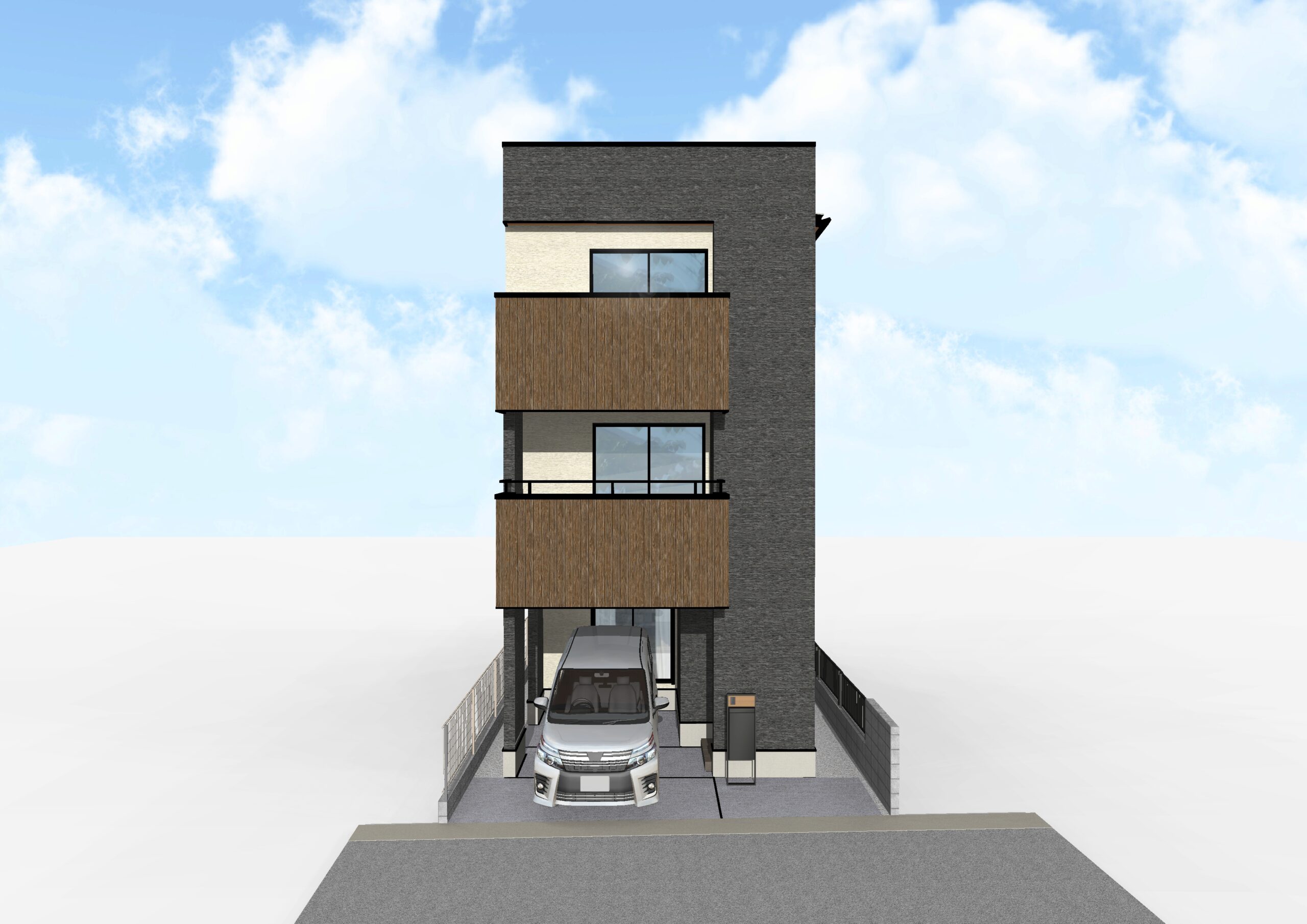 落ち着きのあるグレー×ベージュの外観に、バルコニーの木目調がアクセント。シンプルながら洗練された表情を見せる佇まいです。