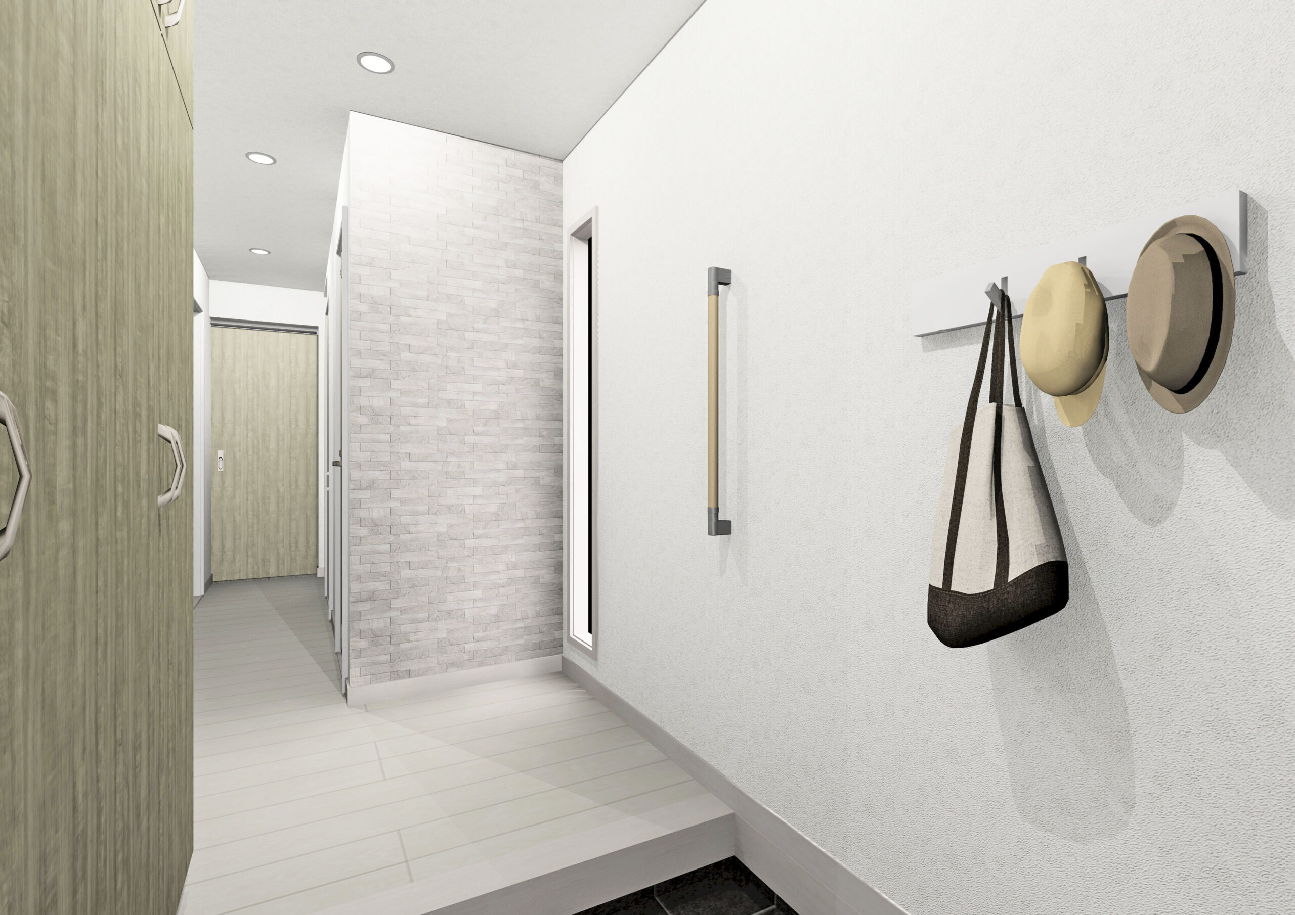 アクセントパネルを使った玄関ホールはW2000トール型下駄箱を設置