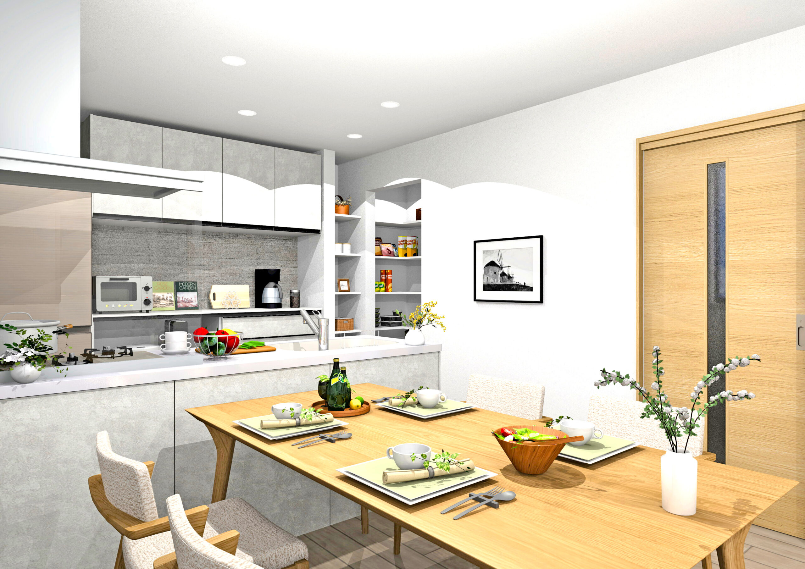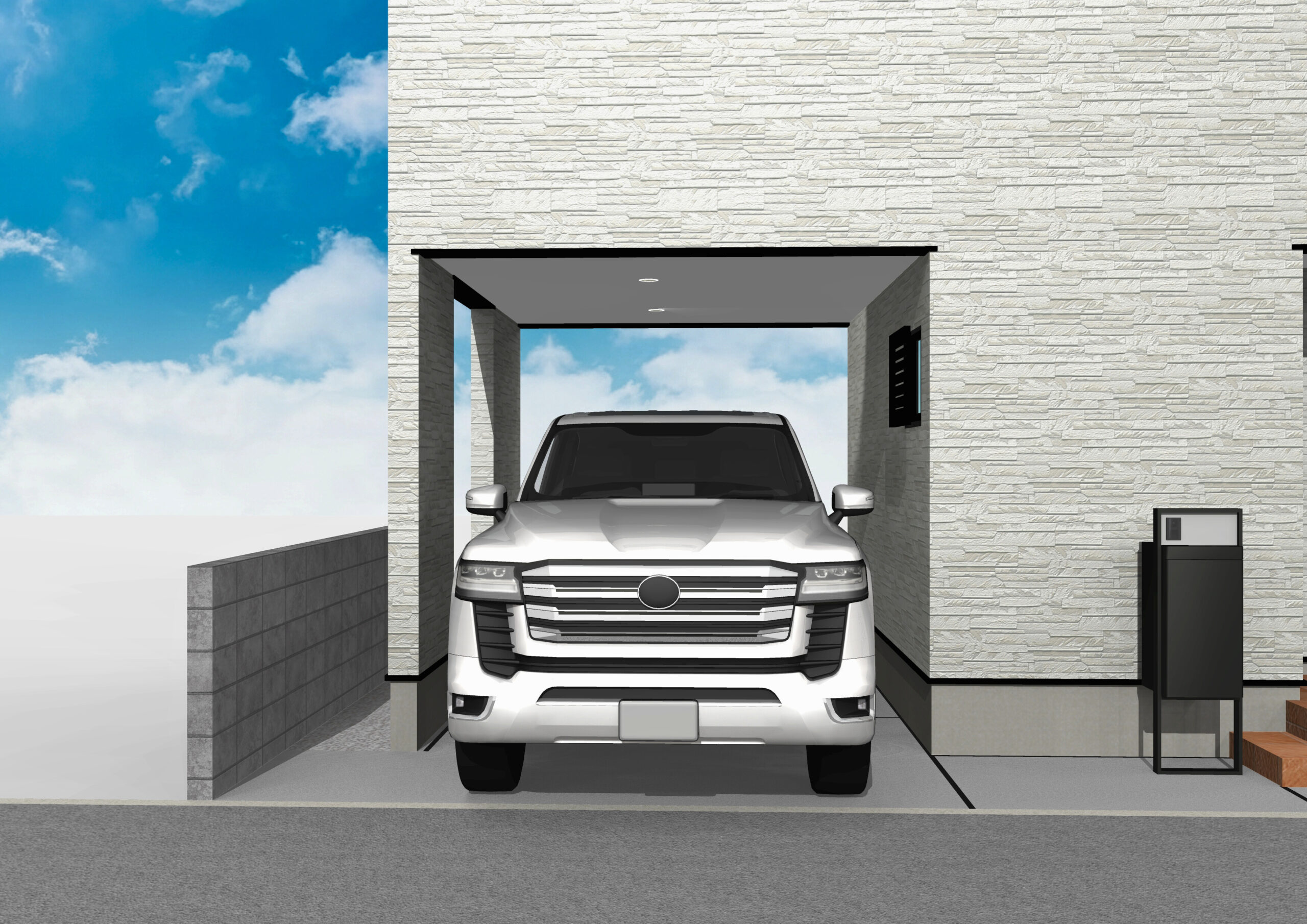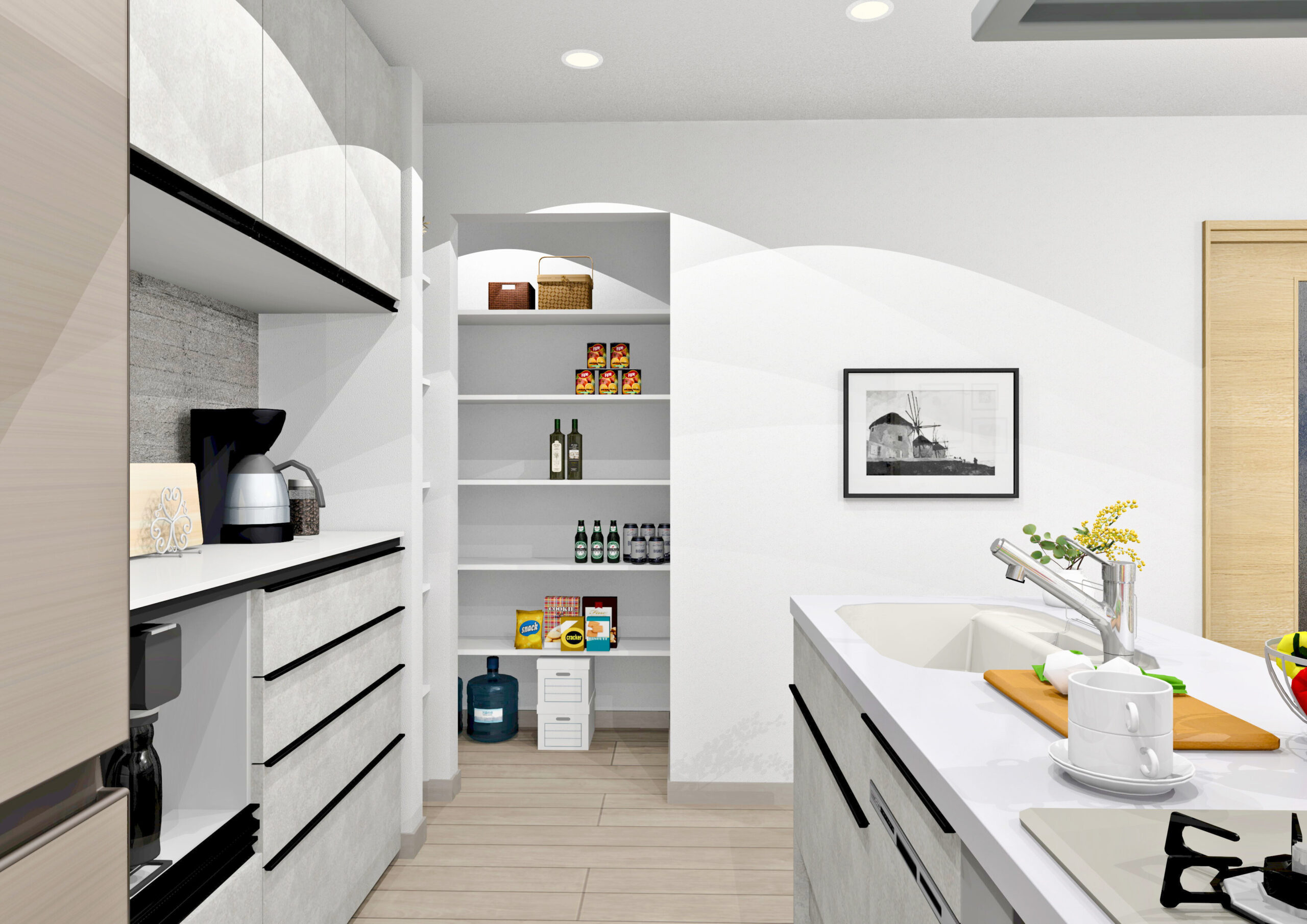 キッチン横にはパントリーを配置し、食品や日用品のストックに便利。車庫付きで雨の日の乗降も快適です。