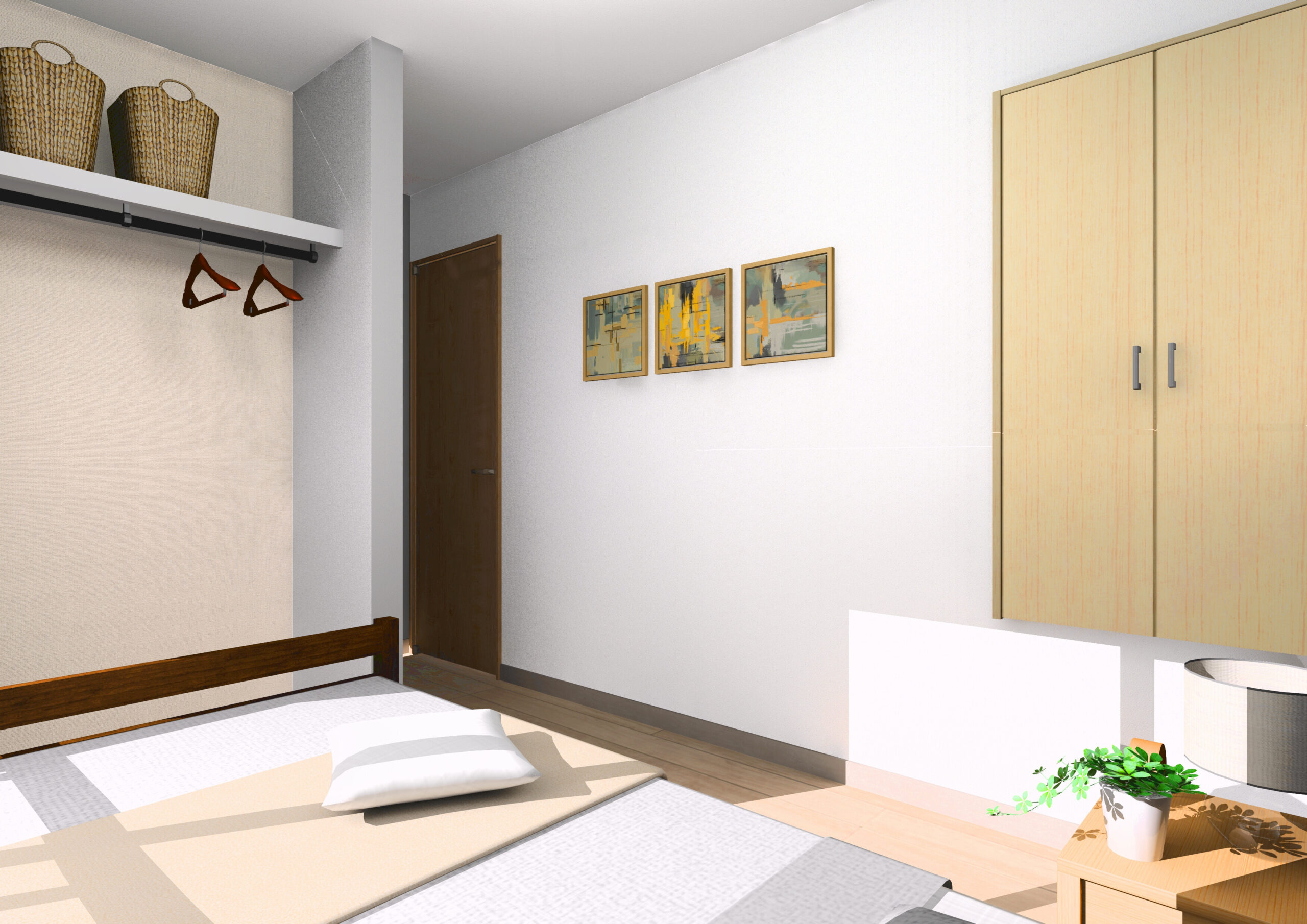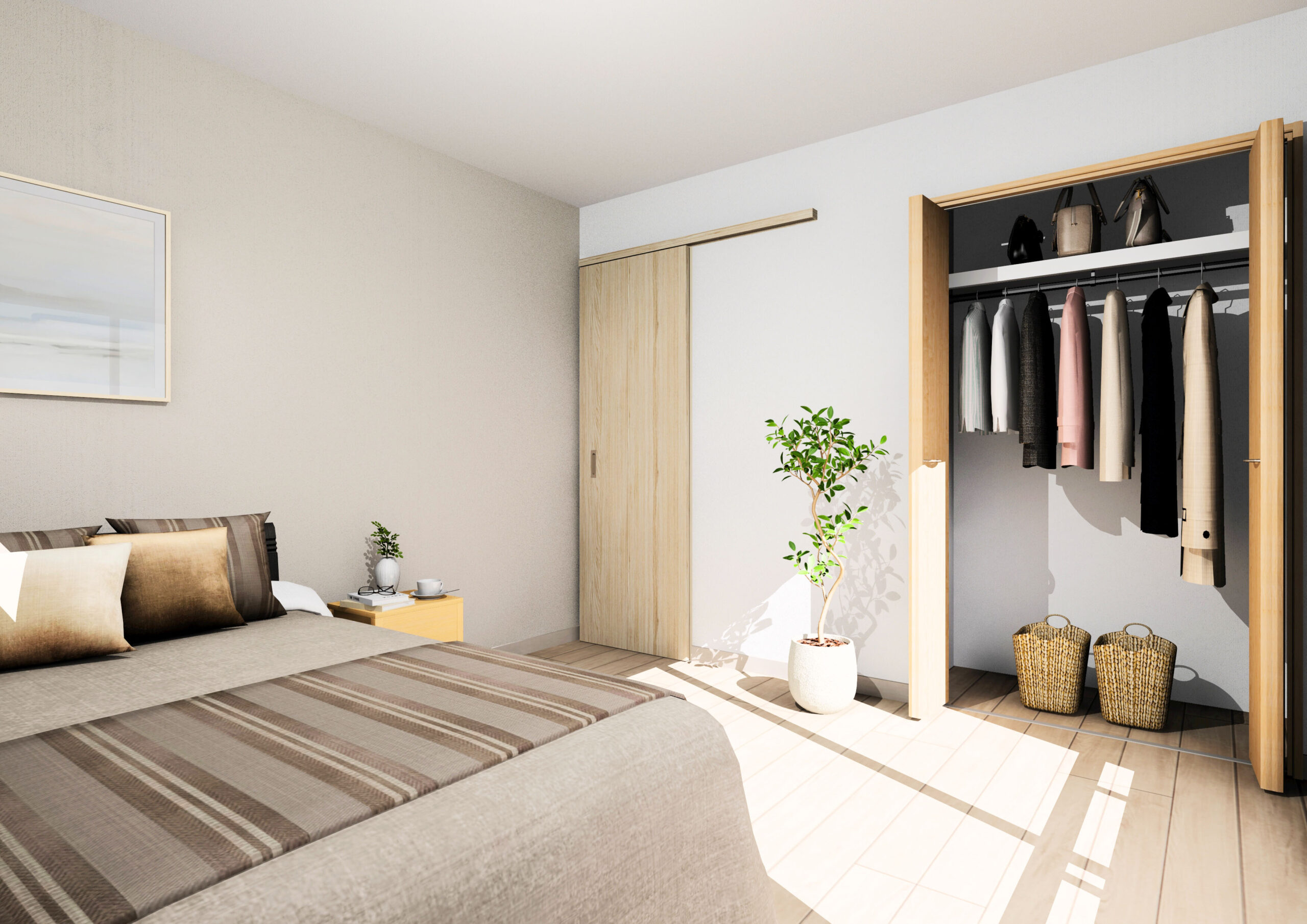 2LDKのプランで、玄関にはハンガーパイプ付き土間収納と可動棚収納を設置。
